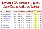 巴恩斯依旧保持着连续三场季后赛的最低命中率【10+出手】