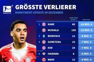 体育资讯12月19日讯 德国转会市场列出了德甲身价下跌榜,凯恩、穆西亚拉身价下降1000万欧居首。