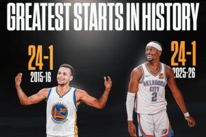 雷霆本赛季目前第28场比赛25胜3负。