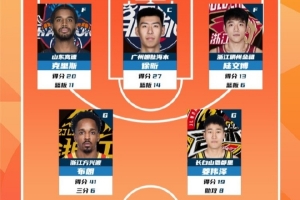 CBA常规赛第4轮最佳阵容:克里斯 徐昕 陆文博 巴里·布朗 姜伟泽