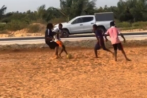体育资讯12月26日讯 巴萨边卫孔德在非洲贝宁度假,与孩子们一起踢球。