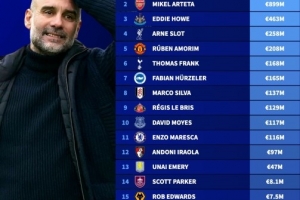 英超主帅在任期间引援净投入排行:马雷斯卡1.16亿欧第11