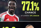 👀英超半程结束后,Opta更新英超夺冠概率: