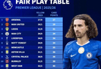 德国转会市场统计了本赛季英超球队获得的红黄牌数量,并按照一定的积分规则进行了排名:
