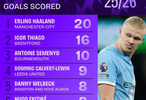 根据Squawka的统计,哈兰德是本赛季五大联赛首位进球数达到20球的球员。伊戈尔-蒂亚戈则成为了单赛季英超进球最多的巴西球员。